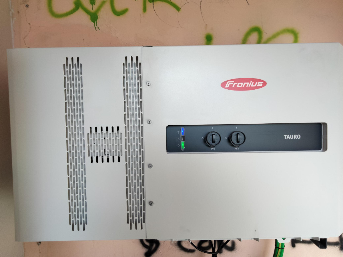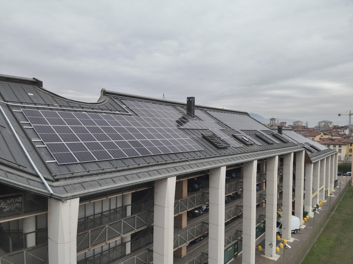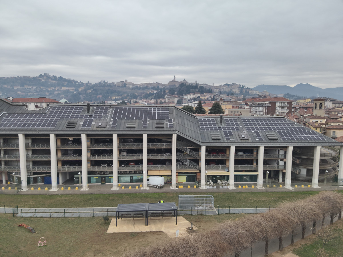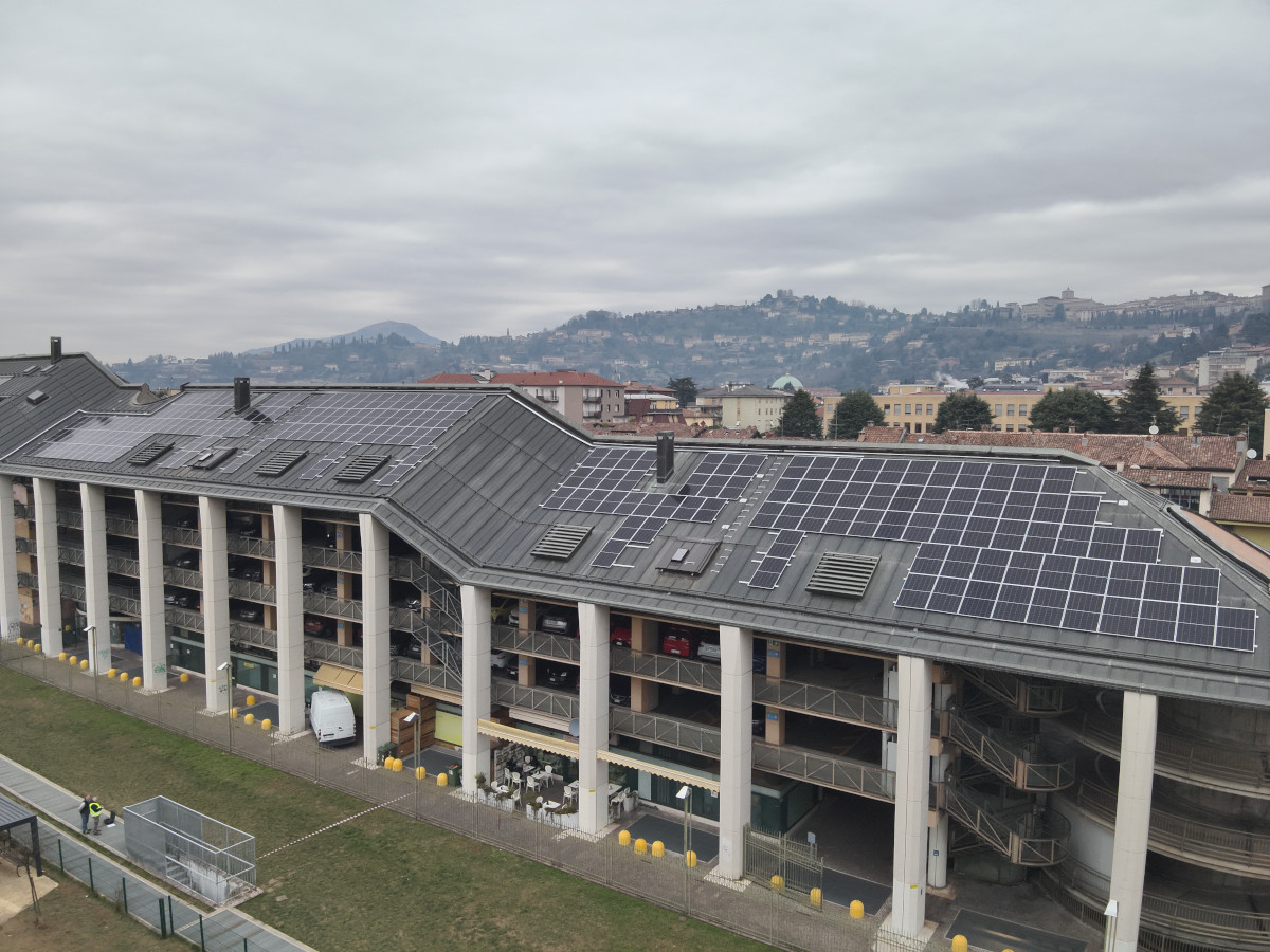 Impianto fotovoltaico installato nel 2025 presso il parcheggio Bergamo Triangolo Parking di Interparking Italia Srl a Bergamo (BG): 198 pannelli solari Viessmann Vitovolt 300-DG M 500 WT per 99,00 kWp di potenza, un inverter Fronius Tauro Eco 100-3-P e un sistema di monitoraggio.